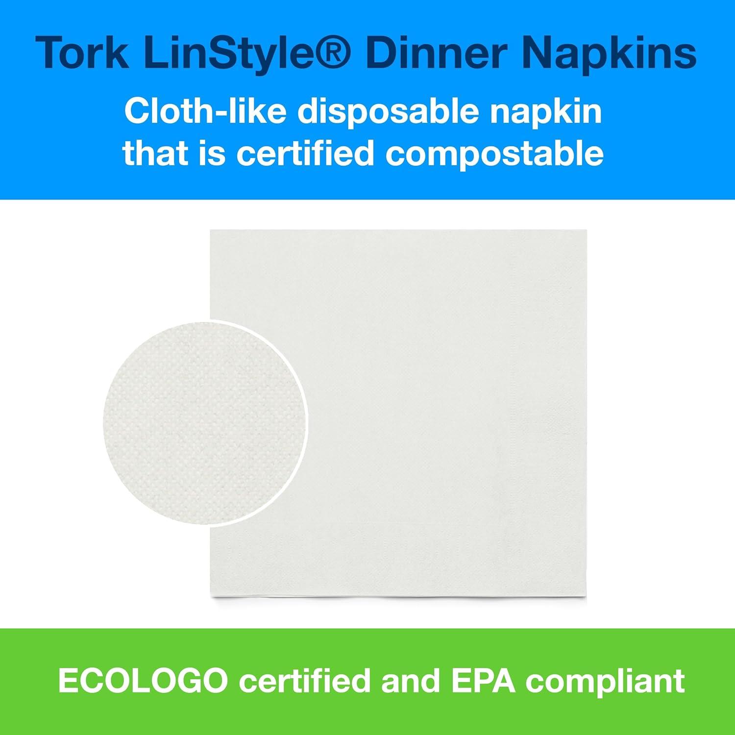 Tork White Dinner Napkin:Enhance your guests' experience with quality and elegance in a cloth-like disposable napkin that is certified compostable. Tork® White Dinner Napkins eliminate hidden costs of linen service fees, replacement and laundering. Noticeably softer, bulkier and more absorbent, they retain the look and feel of real cloth dinner napkins.Advantages at a glance:+ Poly wrapped + Certified compostable+ Look and feel like real cloth+ Convenient and disposable