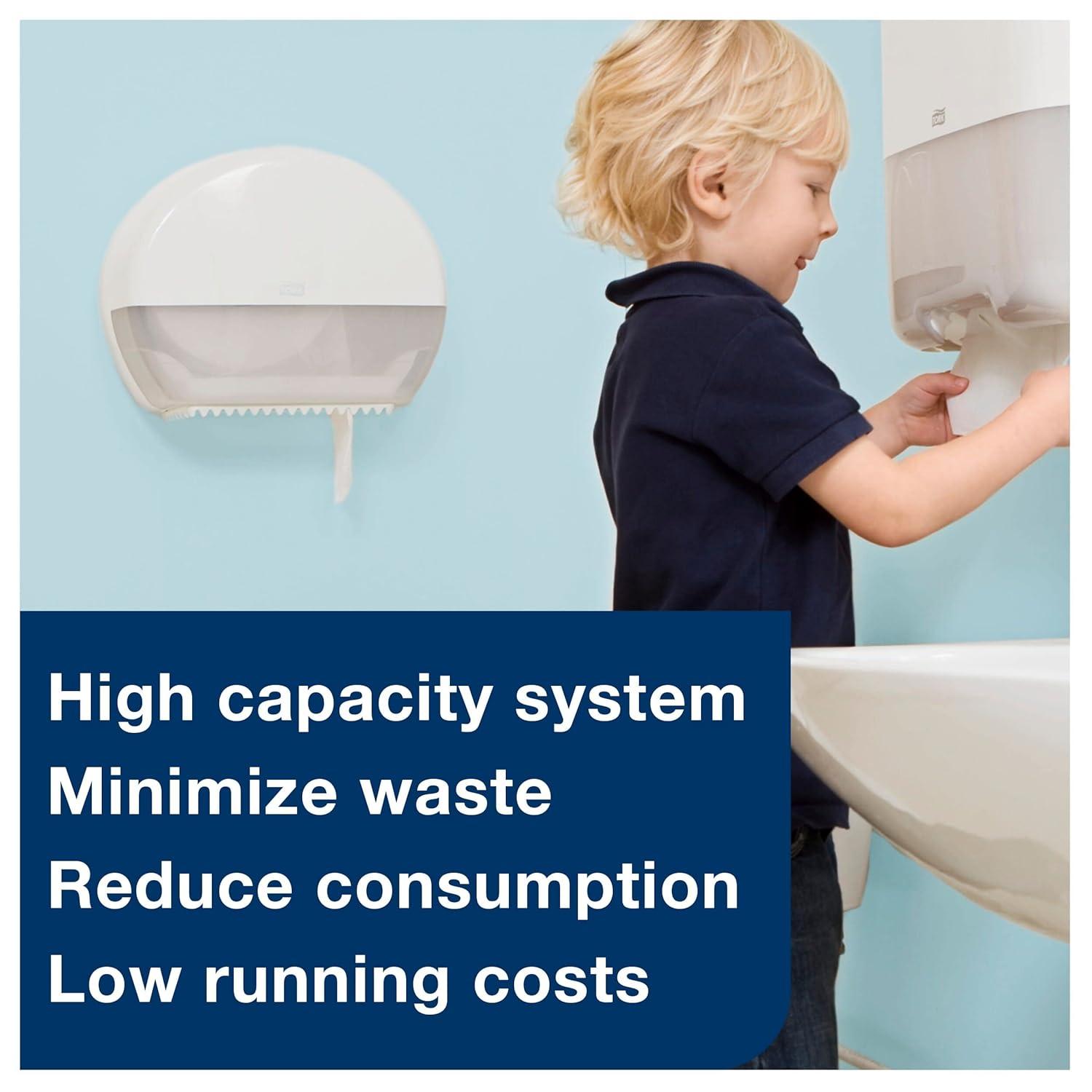 Tork Mini Jumbo Toilet Paper Roll Dispenser T2: Stop overspending on toilet paper by adding this Tork dispenser to your space. Designed for medium to high-traffic spaces, this dispenser reduces cost and improves efficiency. The dispenser's high capacity requires less frequent refills, and a see-through window indicates when you need more bath tissue. A functional, modern design makes a lasting impression on your guests. Advantages at a glance: + High capacity + Modern design + Indicator window + Closed dispenser + Smart, stub-roll holder Compatible with Tork T2 refills