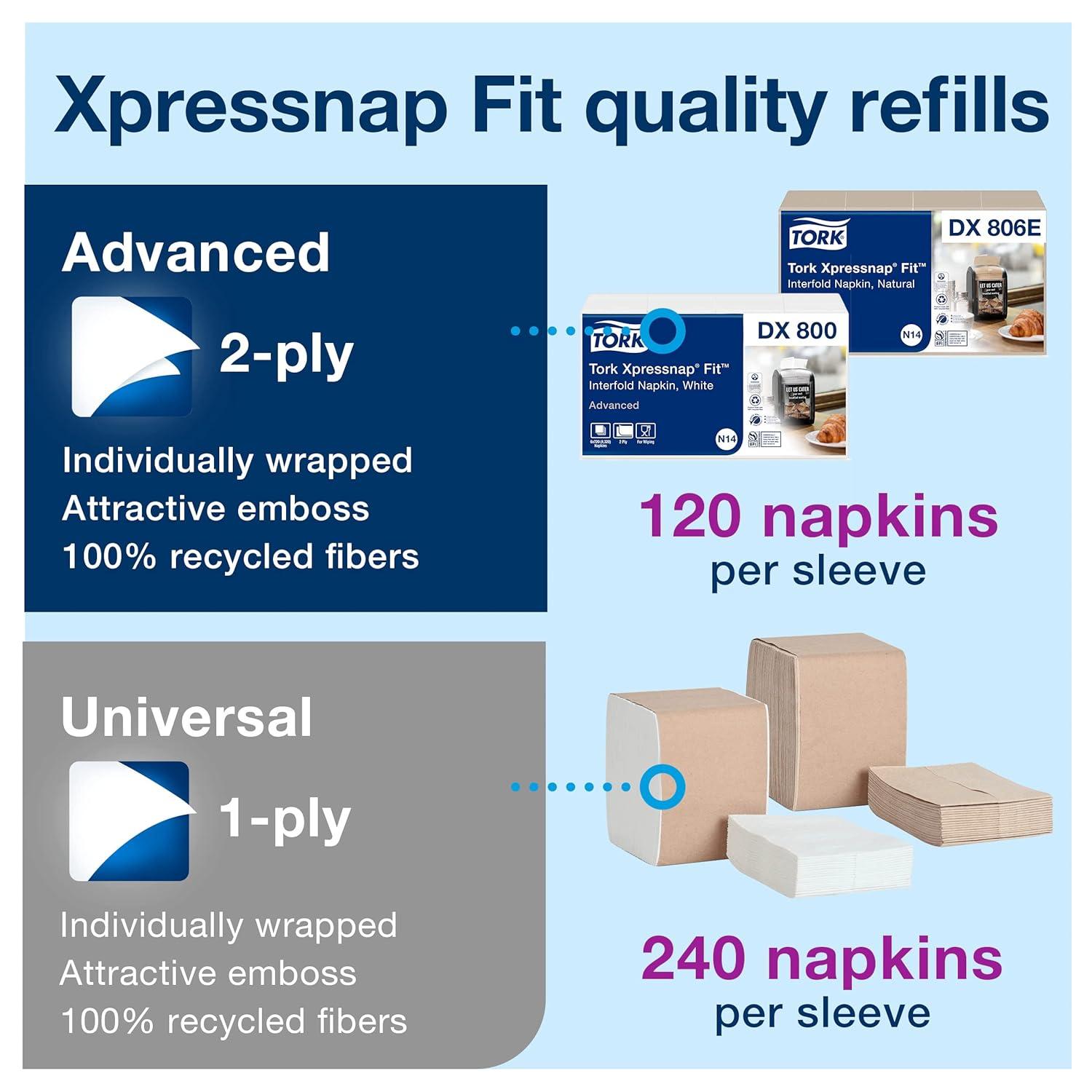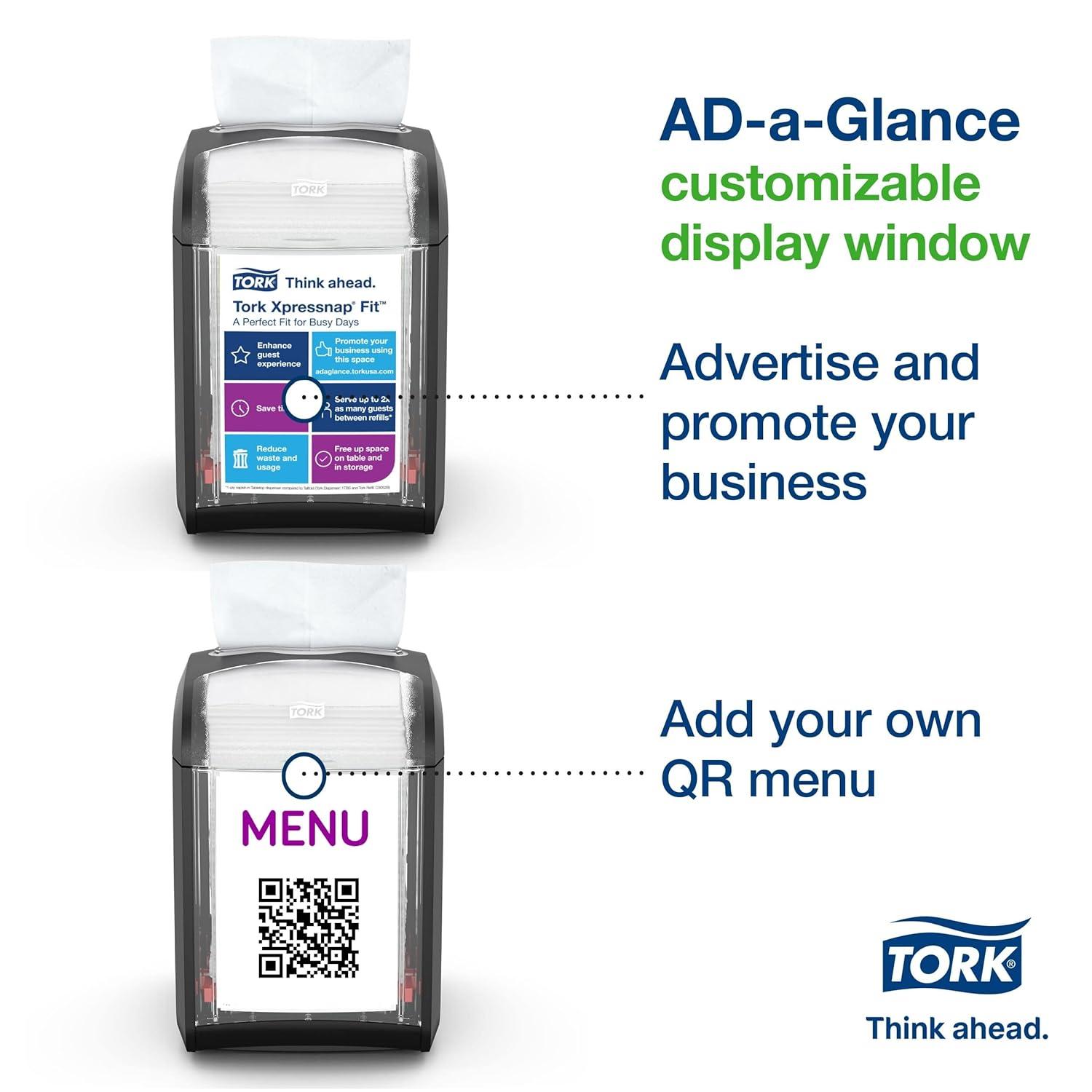 Tork Xpressnap Fit Tabletop Napkin Dispenser Black N14: The Tork Xpressnap Fit Tabletop Napkin Dispenser efficiently serves guests at quick-service restaurants and bars. With a compact, easy-clean design, it's perfect for placing on small tables and bar tops. One-at-a-time dispensing means guests only take what they will use, helping cut napkin waste and making each refill last longer. A refill indicator makes it easy for staff to tell when more napkins are needed. The AD-A-Glance display window makes it easy to promote events or products.