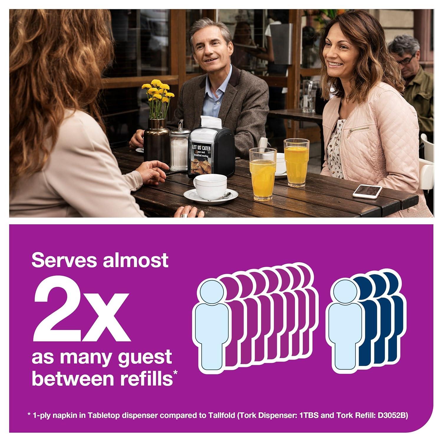 Reduce napkin waste by more than half* with one-at-a-time napkin dispensing. *Compared to Tallfold (Tork dispenser: 1TBS and Tork refill: D3052B)